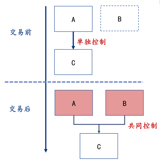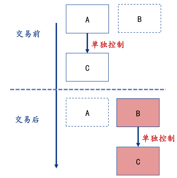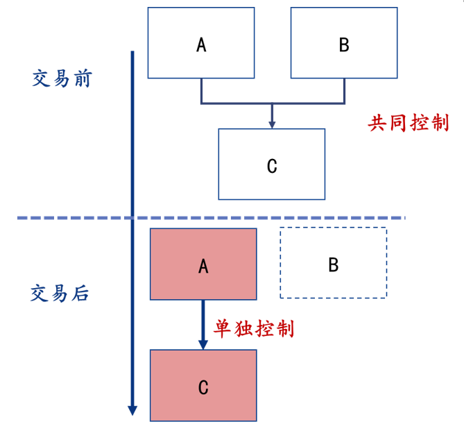 在B公司通过收购取得对C公司单独控制权的情形下,B公司与C公司构成参与集中的经营者。根据现行申报标准,如果B公司的最终控制人(简称“B集团”)与C公司上一会计年度营业额均超过8亿元,并且B集团与C公司上一会计年度在中国境内的营业额总和超过40亿元或B集团与C公司上一会计年度全球营业额总和超过120亿元,则应当依法进行申报。