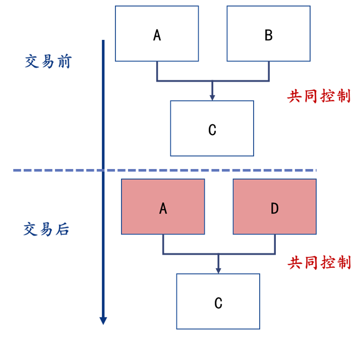 在D公司通过收购取得对C公司共同控制权的情形下,A公司与D公司构成参与集中的经营者。根据现行申报标准,如果A公司的最终控制人(简称“A集团”)与D公司的最终控制人(简称“D集团”)上一会计年度营业额均超过8亿元,并且A集团与D集团上一会计年度在中国境内的营业额总和超过40亿元或A集团与D集团上一会计年度全球营业额总和超过120亿元,则应当依法进行申报。