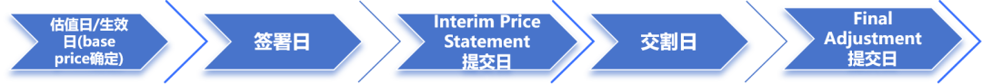 价格调整机制,在跨境并购交易中指买卖双方就估值日至交割日目标公司价值变化对交易价格进行调整的一种机制。在交割日前,卖方需要向买方提交Interim Price Statement或由买方再次就目标公司财务状况进行调查,以确认交割日目标公司价值。该等Statement或调查距离交割日越近越好,但实际情况往往不佳,因此,如采用该机制,则一般需要约定在交割日后仍要就交割日再提交Statement或再进行一次调查。即,原则上买方最终支付的应为根据交割日当日目标公司的价值换算的价格。相关推进时间点图示如下: