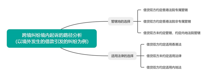 在内地法院拥有管辖权的前提下,当事人需要进一步判断的是就争议的法律关系适用的法律选择问题。由于借贷主体的一方是香港主体,而借款发生于香港地区,境内法院在受理后需要界定案件中的法律是适用香港地区法律抑或内地法律,因两者对借贷的规定差异极大(比如利息上限及诉讼时效),这一问题将产生如下几种情形。