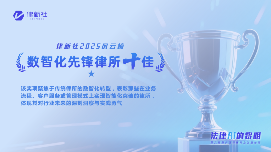 本次评选聚焦于传统律所的数智化转型,重点表彰在业务流程优化、客户服务体验提升及律所管理模式升级等方面实现智能化突破的先进代表,充分体现其在数智时代对行业未来的前瞻洞察与坚定实践。