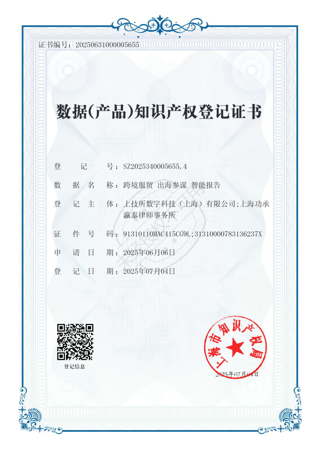 近日,由上海功承瀛泰律师事务所联合上技所数字科技(上海)有限公司开发的两项数据产品——“出海参谋·智能报告”与“科创智签·智能合同生成”,顺利完成上海数据知识产权登记中心的产品登记。这是我所首次以律师事务所名义申报并成功登记的数据产品,是功承瀛泰数据合规委员会与科创中心紧密协作与创新实践的成果,标志着我所在科技赋能法律服务的探索中迈出了关键性的一步。