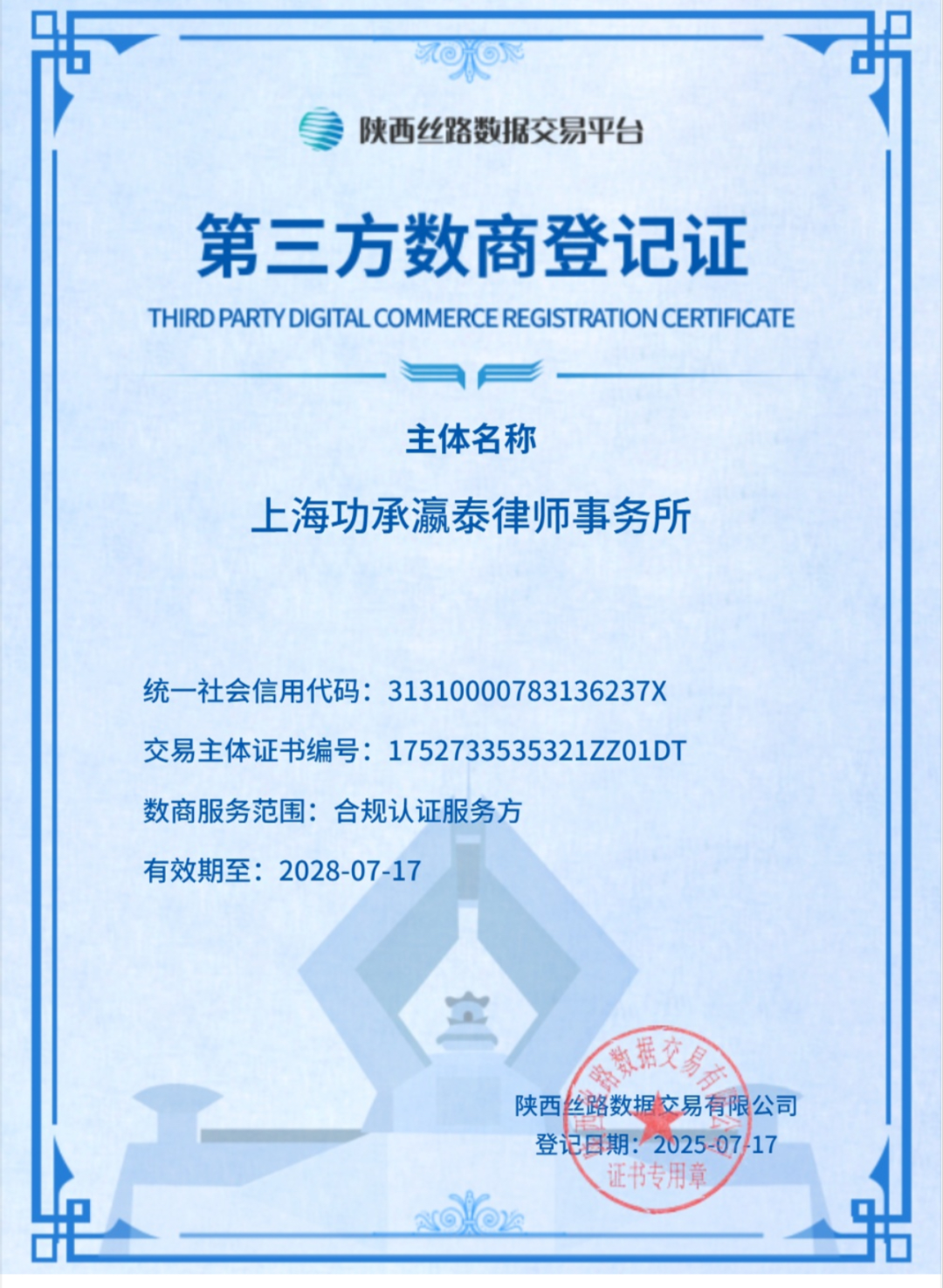 近日,上海功承瀛泰律师事务所成功通过陕西丝路数据交易平台审核,荣获“第三方数商登记证”,成为合规认证服务方。这标志着功承瀛泰在数据合规与数字经济法律服务领域的专业实力与服务能力再次获得权威认可。